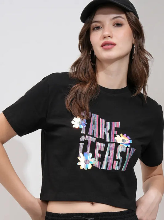 Suburbans Women Black Mickey Mouse Printed Boxy Fit T-Shirt