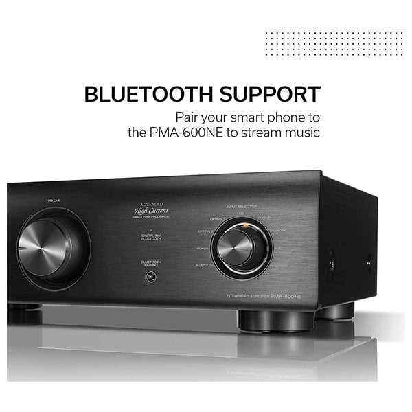 The Denon PMA-600NE allows for the most diverse and emotional reproduction of vinyl and Hi-Res audio that requires digital inputs and a built-in phono equalizer. Designed for the music lovers and enthusiast , the Denon PMA-600NE is the priority for those who want to build their first 2-channel Hi-Fi system. Easily Listen to your favorite music via Bluetooth as well for seamless streaming of nearly unlimited songs. The quality has been so immense that From deep bass to detailed highs, you have all easy access to listen to your favorite high-resolution audio content with the 192kHz/24bit D/A converter.