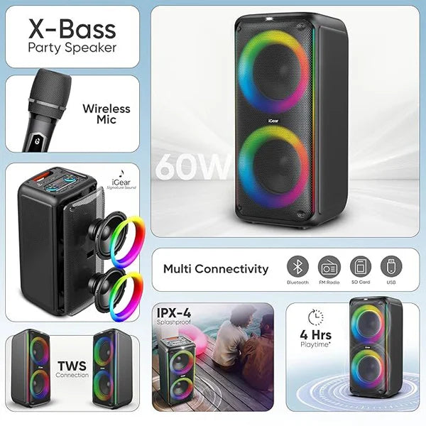 - Dynamic Sound Performance: Immerse yourself in a superior audio experience with the 60W Party Speaker’s meticulously engineered sound system. The dual bass radiators bring depth and richness to your music, ensuring that every beat, rhythm, and melody is delivered with exceptional clarity. From heart-thumping bass drops to crystal-clear vocals, this speaker takes your music enjoyment to a whole new level.