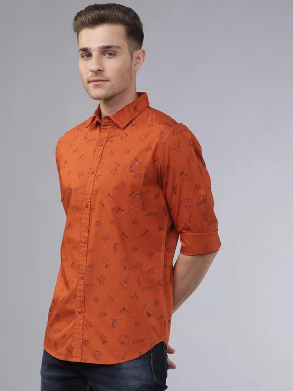 - product description Elevate your casual style with this slim-fit rust casual shirt featuring a graphic pattern and cutaway collar. Crafted for comfort and style, this full-sleeve shirt is perfect for everyday wear.