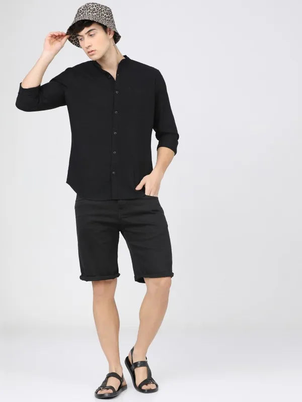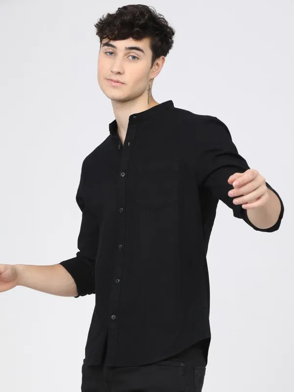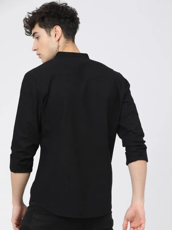 - product descriptionHeading for an interview or out on a date? Ketch can certainly expect this statemen black shirt to stick around for another season at the very least. A more structured slim silhouette with a mandarian collar and full-sleeves adds a flourish to this shirt. Pair this with straight pants for a formal or shorts for a casual look, and you are good to go!