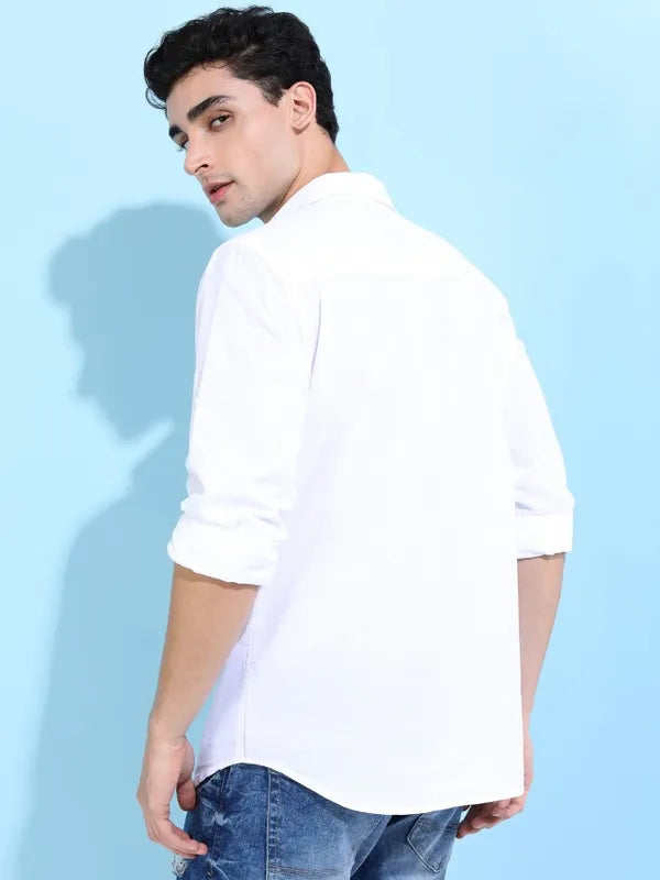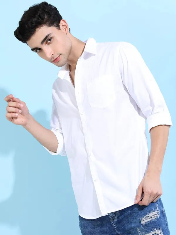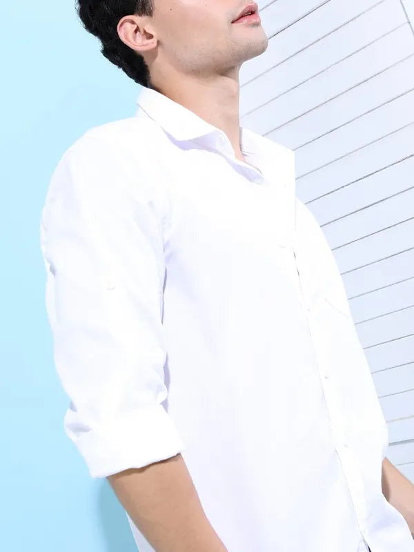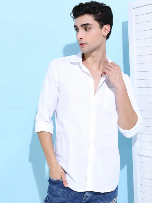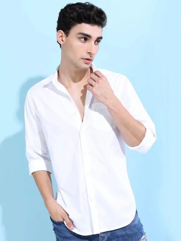 - product description For a man who cares about what he looks like, this slim-fit white shirt will be the perfect choice. Featuring a cutaway collar, long sleeves, and a curved hem, this cotton shirt is comfortable and perfect for any occasion. It also comes with a solid look that adds to its style element and will keep you looking dapper whether you are out on a date or attending an important lunch meeting with your client.