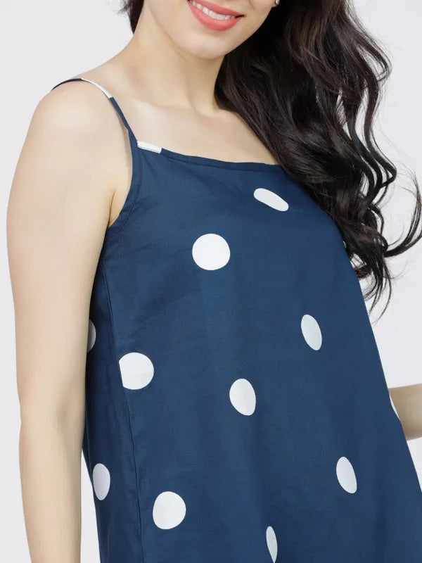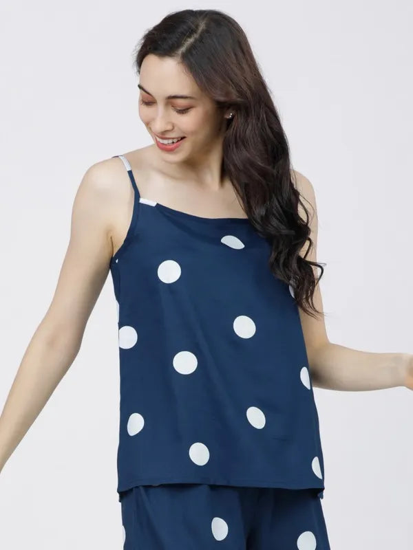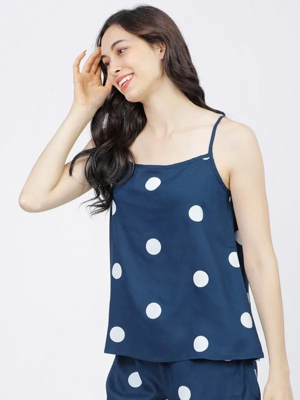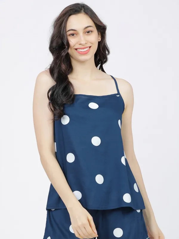 - product description The perfect strappy teal blue printed cami-top for making a fashion statement, this elegant piece is made of viscose rayon and has a round neckline and shoulder straps. The fabric is soft and breathable, perfect for the warmer seasons. Slip-on weara bility adds to your ease and the polka-dot print enhances the charm of this piece.