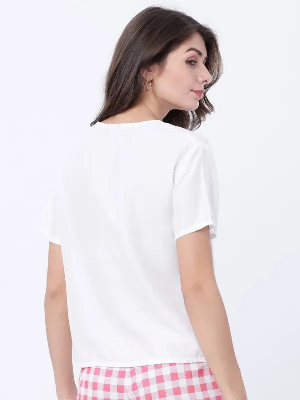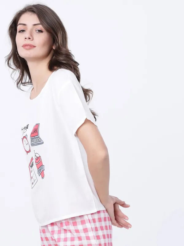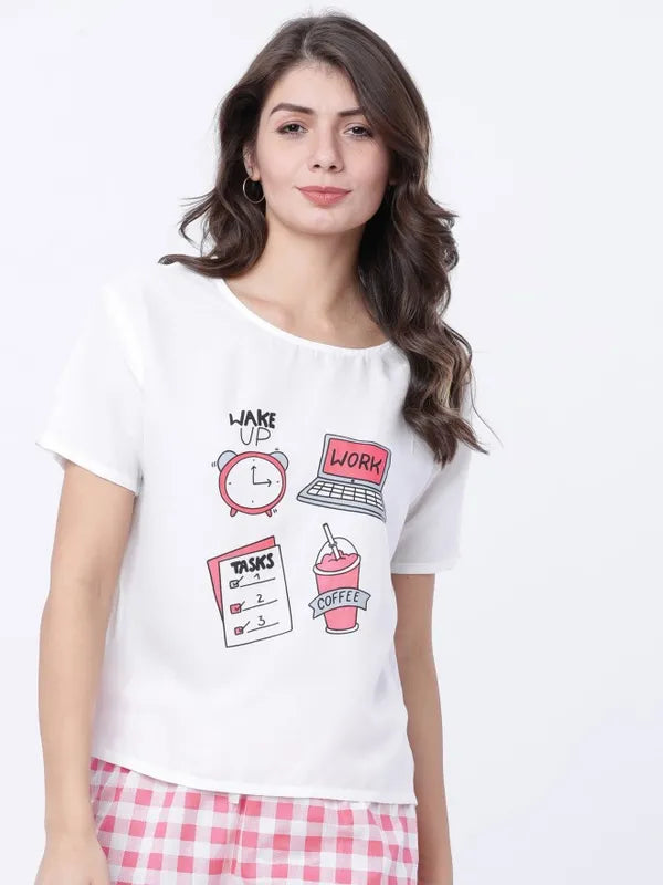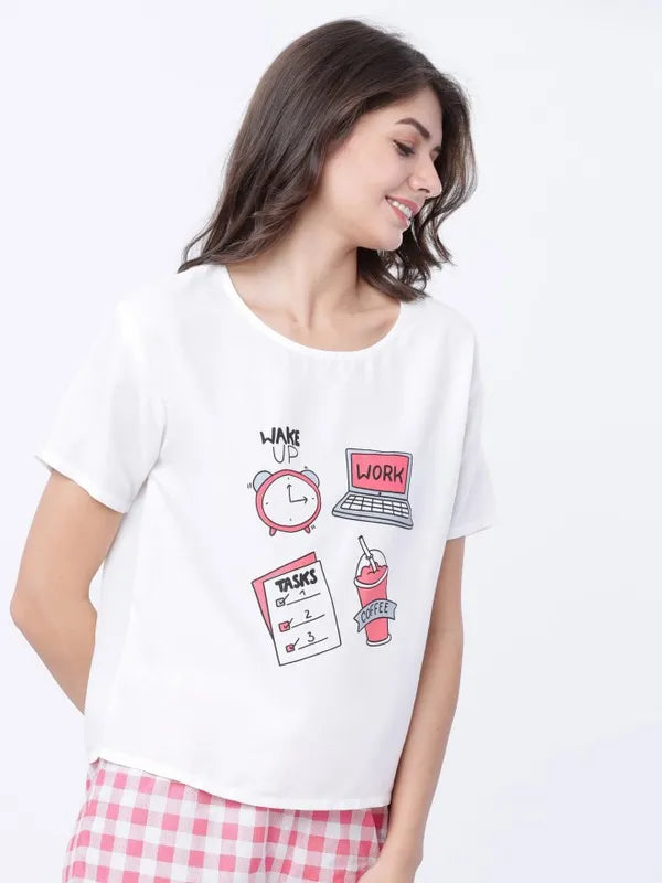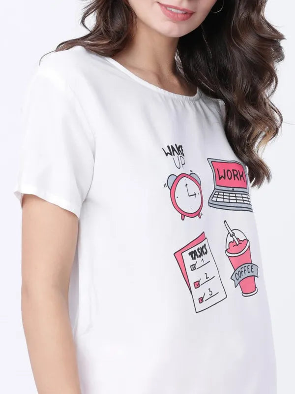 - product description Usher in the summer season with this white printed lounge-top for women. This Suburbans top has a round neck with short sleeves, and slip-on wearability so you can be hassle-free. Crafted with viscose-rayon blend to ensure maximum comfort, this lounge top will be the perfect addition to your sleepwear collection.