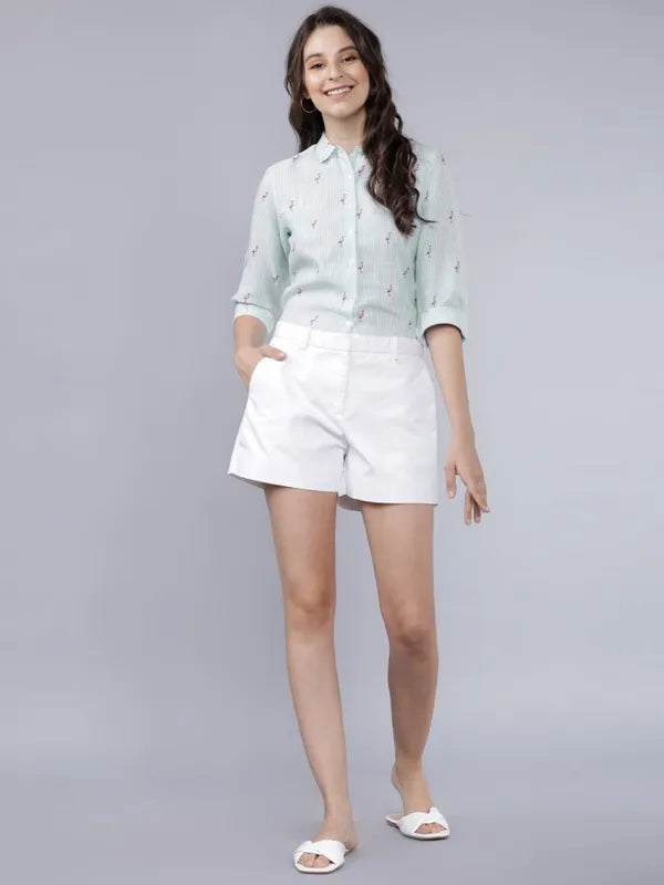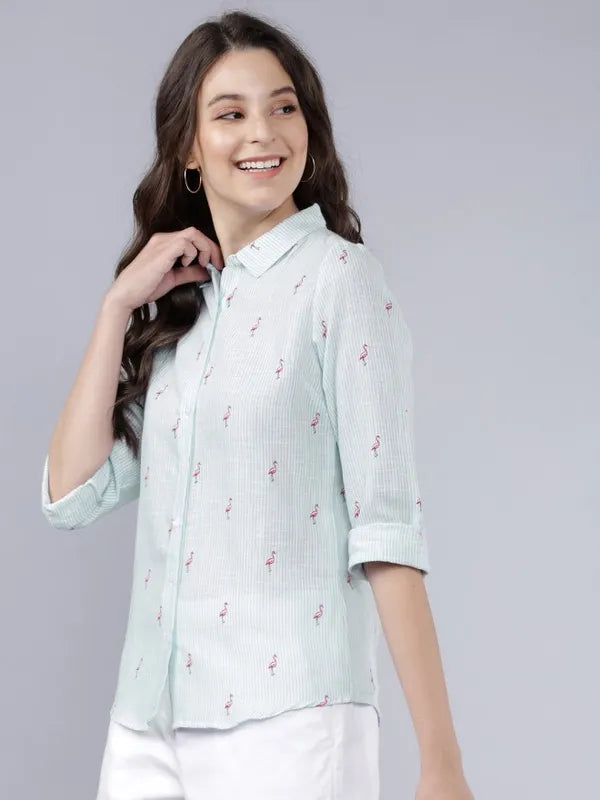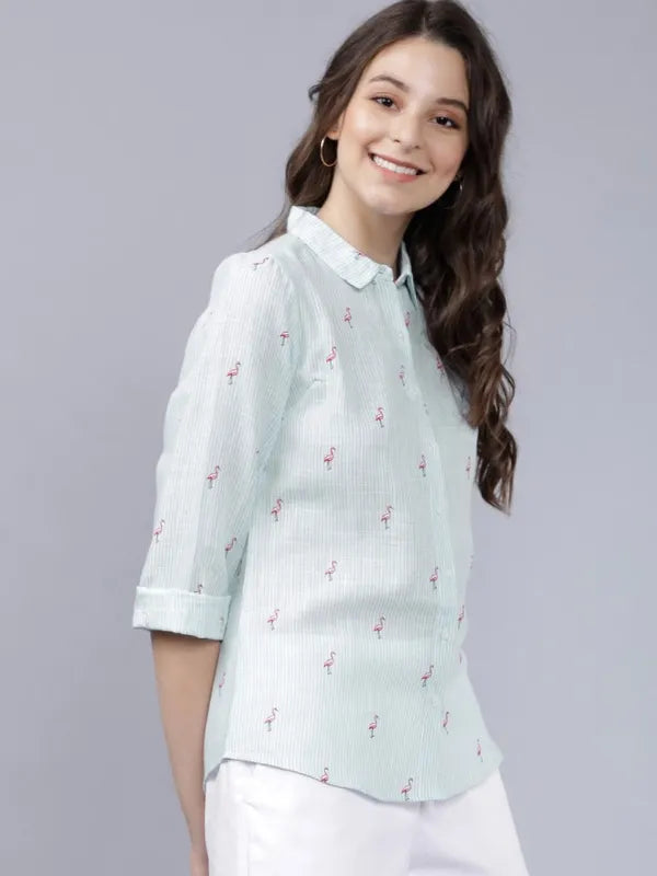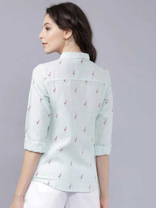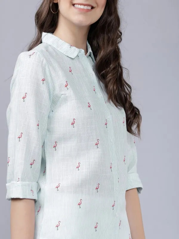 - product description What makes you happy? Turned heads. Wear this noteworthy cotton shirt in blue from Suburbans with all over striped print and bird motifs. Its front knot style, spread collar and buttoned-down placket makes this a perfect summer wear shirt.