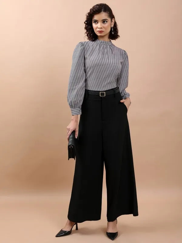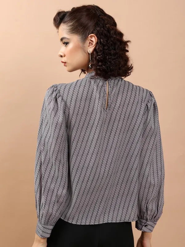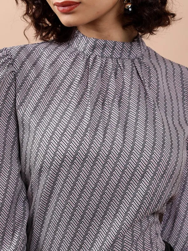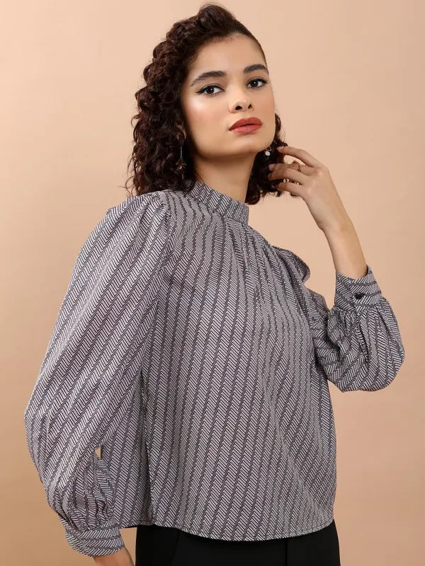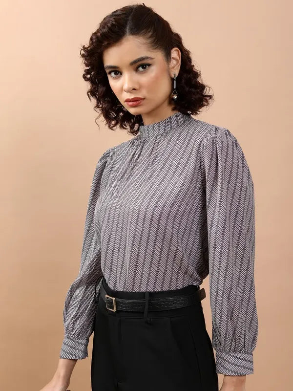 - product description Enhance your wardrobe with this elegant white top adorned with an eye-catching geometric design. This top is tailored with long sleeves and a sleek mock collar, offering a regular fit. It is made from soft polyester, providing both comfort and long-lasting wear. Ideal for any event!