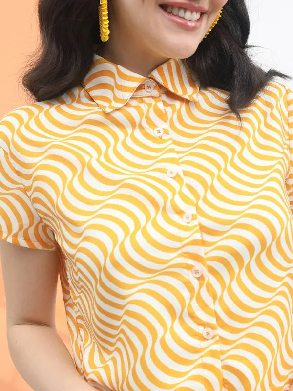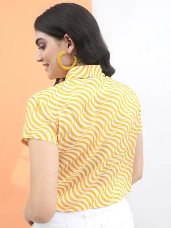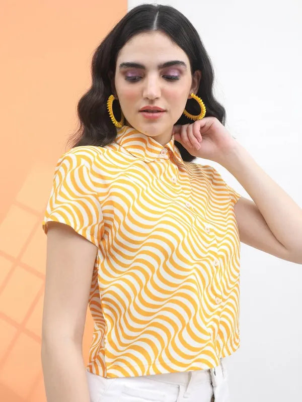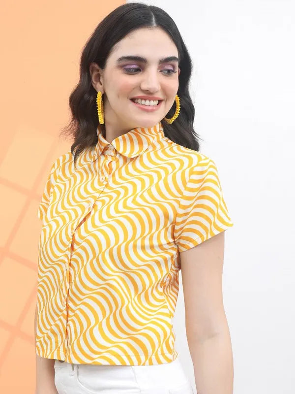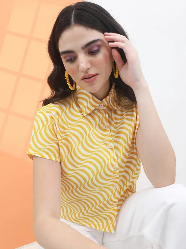 - product description Redefine your basic style with this amazing regular fit white shirt with abstract pattern. Tailored in polyster fabric, perfect to breathe in summers, it has crop length with short sleeves.