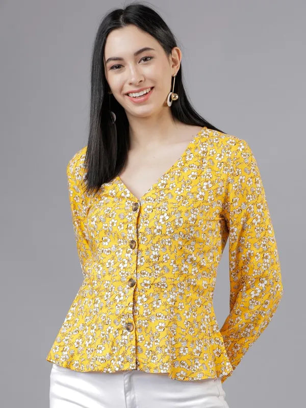 - product description The perfect balance between playful and sweet, this peplum top is the perfect addition for work or play. This yellow printed top for women has a flattering V-neck, long sleeves and front button closure. Made from soft fabric, this casual top can be worn all year round in any season.